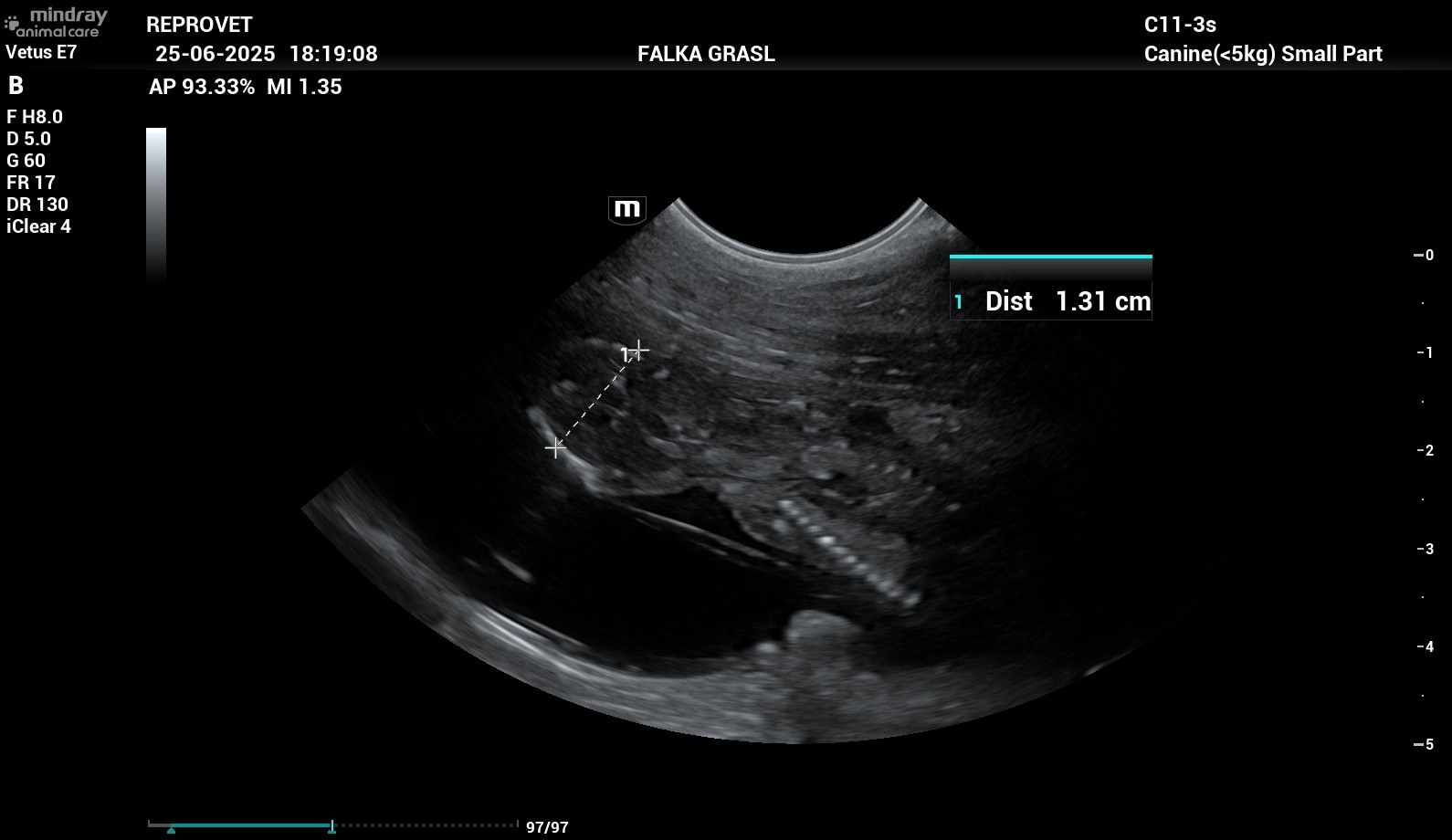 Falka hat heute wieder Kontrolltermin, Dieter und sie fahren bei einer Affenhitze zur Tierärztin, aber es muss sein. Denn wir wollen, dass Falkas Trächtigkeit für die Welpen und die Mutterhündin gut verläuft und es gibt uns als "Erstlings-Züchter" das Gefühl, nichts zu übersehen, wenn man engmaschige Untersuchungen durchführen lässt. Auf jeden Fall ist es so, dass alles bestens ist: Die Kleinen gedeihen prächtig, sie sind jetzt in etwa 6 cm lang, Falkas Bauchumfang ist auch schon um 8 cm gewachsen, die Embryonen bewegen sich heftig in Falkas Bauch sagt Dieter.