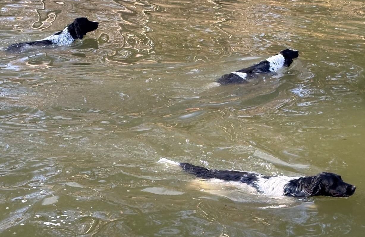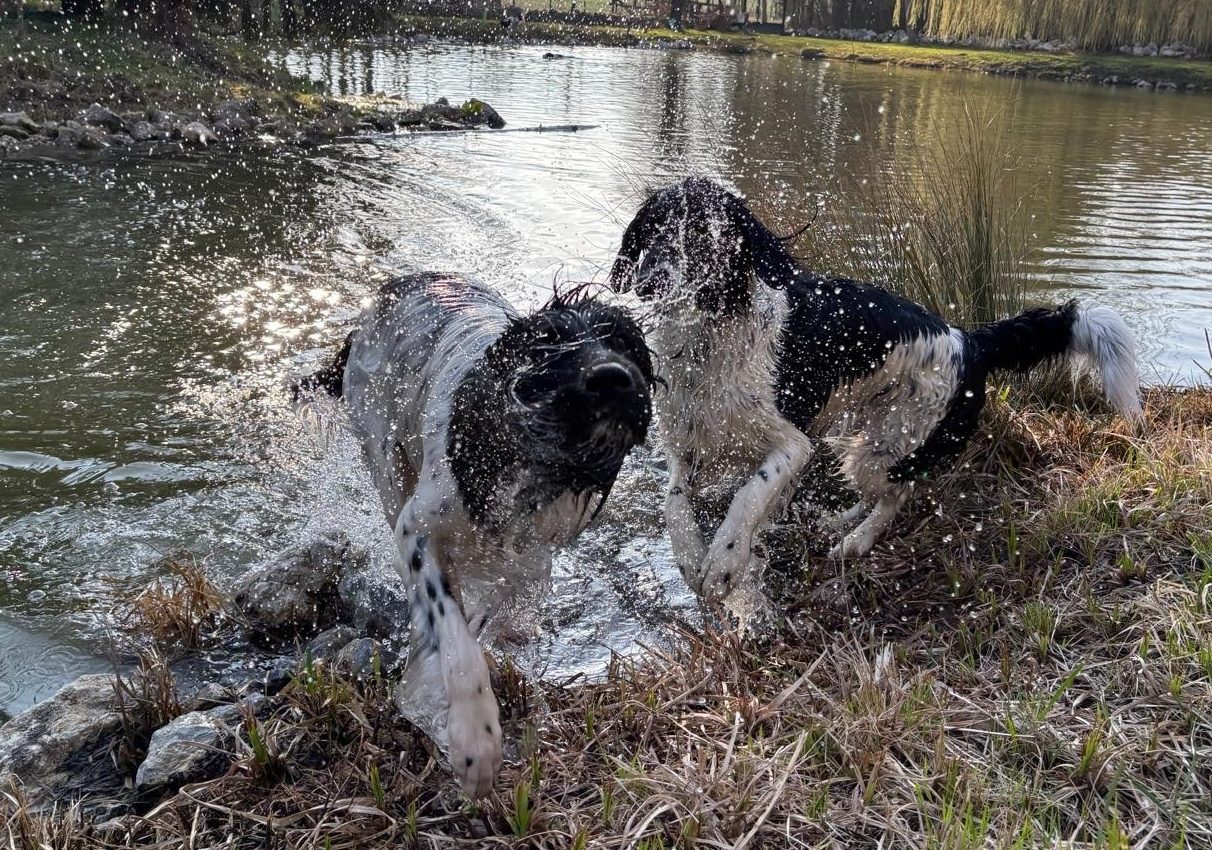 Ausklang findet der Sonntag mit einer Runde um den Teich, die Hunde sind allesamt sehr aufgeregt, da kurz bevor wir kommen ein Erpel seine Runden im Wasser zieht. Das bedeutet, dass alles genauestens untersucht werden muss, inklusive einigen Schwimm-Einheiten natürlich! Danach Trocknen auf den gemütlichen Decken und die Zweibeiner trinken Kaffee ;-)
