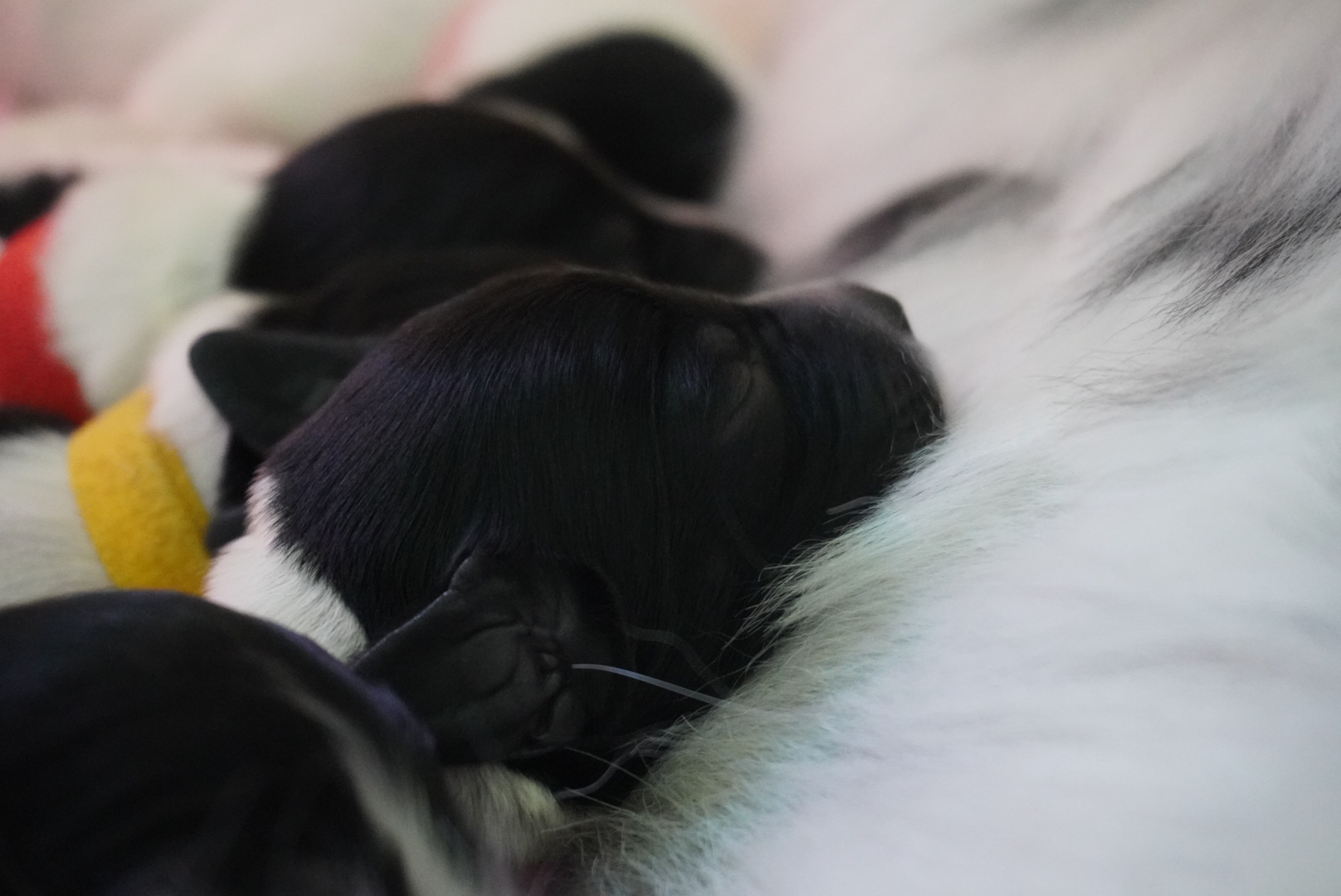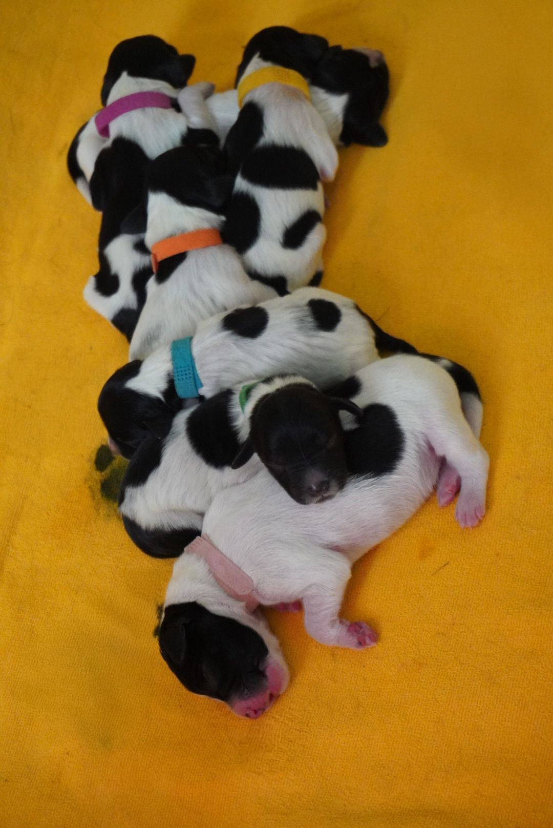 Während Falka sich ausgiebig putzt, döst Dieter ein ... plötzlich hört er ein leises Fiepen aus der Ecke, wo Falka sich eingerollt hat. Mit der vorbereiteten Taschenlampe leuchtet er hin und sieht zwei (!) Welpen, die gerade von der Hundemutter geputzt werden. Schnell weckt er Nina, Resi und Konstantin auf, um weitere Helfer zu haben. Wir übersiedeln Falka und die zwei Babies in die Wurfbox und schon geht es weiter. Nach zwei Wehen ist der nächste Welpe geboren. Falka macht die Fruchtblasen auf, animiert die Welpen zum Atmen und nabelt sie ab. Nachdem die Kleinen ziemlich rasch hintereinander kommen, übernehmen wir Zweibeiner die Nachbetreuung. Wir rubbeln die sieben Welpen trocken, wiegen sie ab, markieren sie und kontrollieren ihre Reflexe.